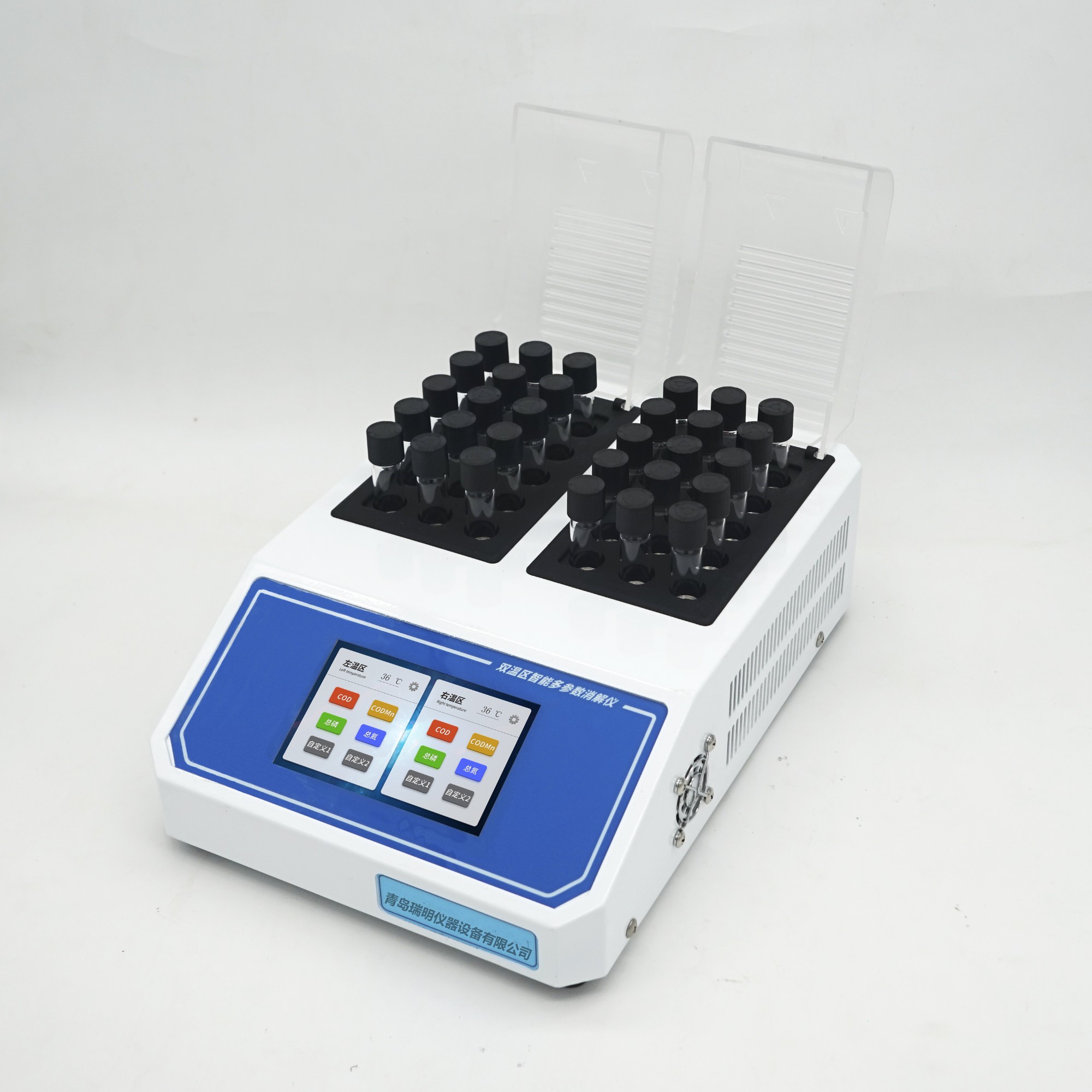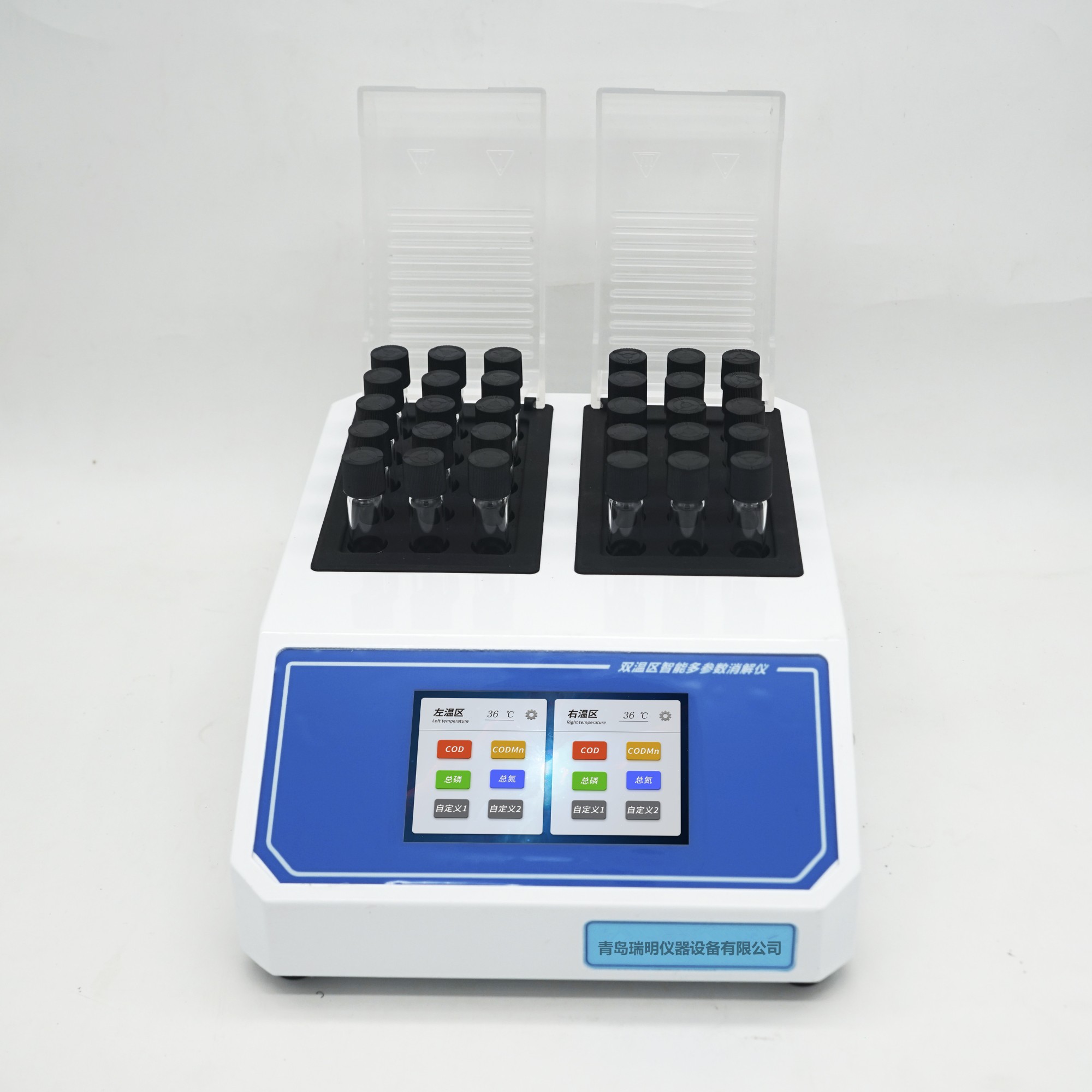 MA-104型双温区智能消解仪是一种快速测定化学耗氧量的加热装置。它具有两个独立的消解温区,双温双控。可进行COD、总磷、总氮等样品消解预处理。该仪器可以自动完成恒温计时时间,温度恒定时间到达后仪器具有自动声报警功能,自动关机,无需人工参与。温度漂移小,恒温精度高。它采用PID温控器,时间控制器、升温速度较快,温度缓冲小、温度恒定均匀等特点,操作简便,是一种实验手段仪器化新产品。具有体积小、节水、节电、恒温性能好等优点。可广泛用于环保、高等院校、医药、卫生、食品、自来水、化工、污水处理、造纸、石化、冶金、印染等行业。