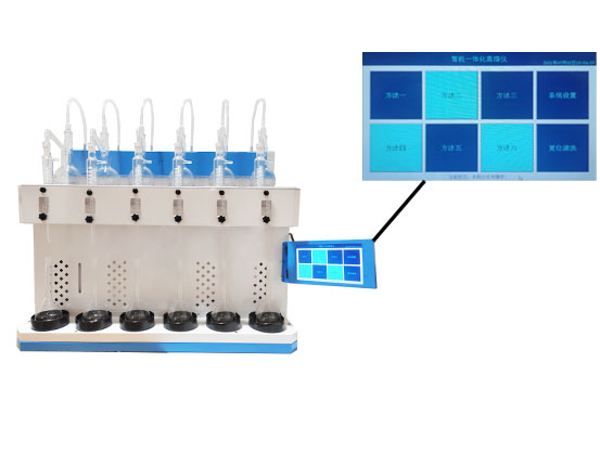 智能一体化蒸馏仪采用智能模块化设计:方法自定义设置保存/读取、一键调取使用;远红外辐射加热技术、冷凝单元特殊定制蛇形冷凝管、智能终点控制防过量蒸馏、防倒吸保护、冷凝管馏出管一键智能清洗等技术,实现了智能操作简单、自动蒸馏、美观实用、节能降耗、节省人工的同时为用户做样提**率节约人员成本开销。